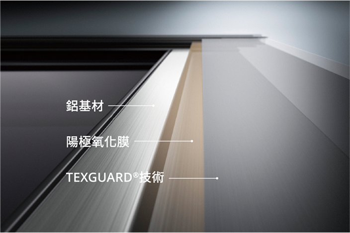 使用 「TEXGUARD 高耐性塗料」之陽極酸化複合皮膜,耐腐蝕性達一般陽極處理高出約 2 倍,符合 JIS 日本國家標準 A1 種類。